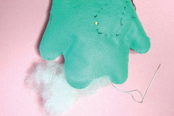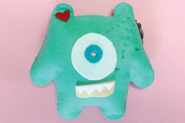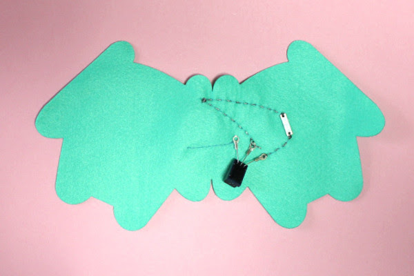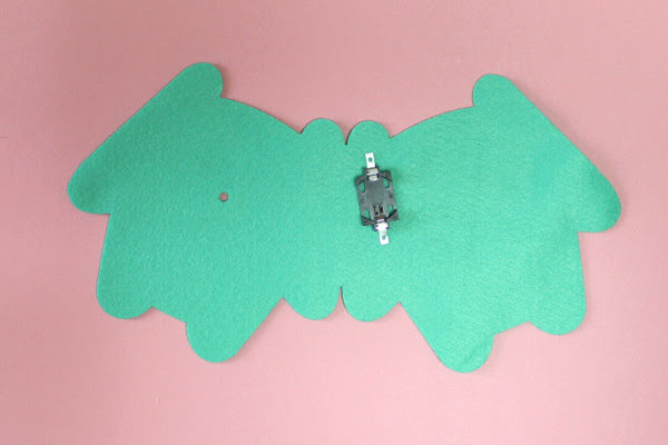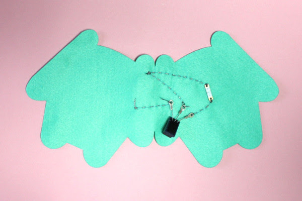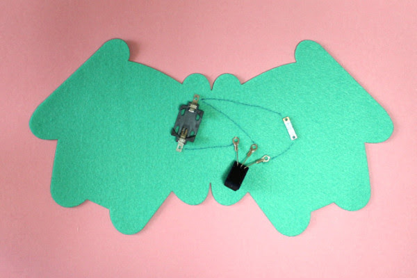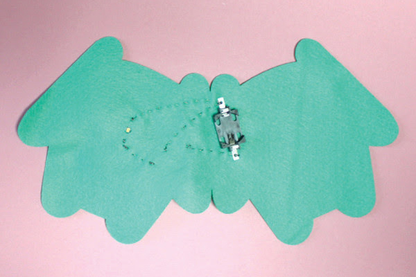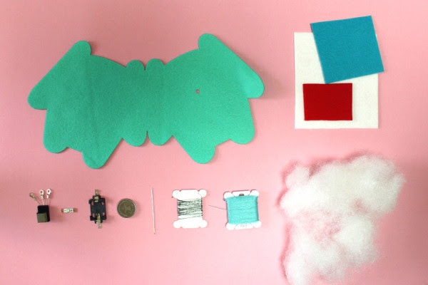 준비물 : 펠트지, 터치센서, 납작LED, 전지홀더, 3V전지, 바늘, 전도성 실, 그냥 실, 솜 인형 도안 위에 부품들을 배치하고 극성을 구별하여 바느질 선을 볼펜으로 그려요. 실제 부품이 놓이는 곳이예요. 이렇게 각각 안쪽면과 겉면에 놓이겠죠. (위가 안, 아래가 밖) 총 4구간의 바느질을 해주세요. 뒤집어서 겉면을 보면 이렇게 됩니다. 전지홀더에 전지를 끼우고 터치센서 부분을 꾸욱 누르면 LED에 불이 들어오지요. 인형을 반으로 접고 가장자리를 꿰매주세요. 솜을 넣고 마무리합니다. 남은 펠트지로 눈과 입을 만들어 주었어요. 손을 잡아주니 눈에서 반짝반짝 빛이 나오는 터치몬스터 완성이예요.