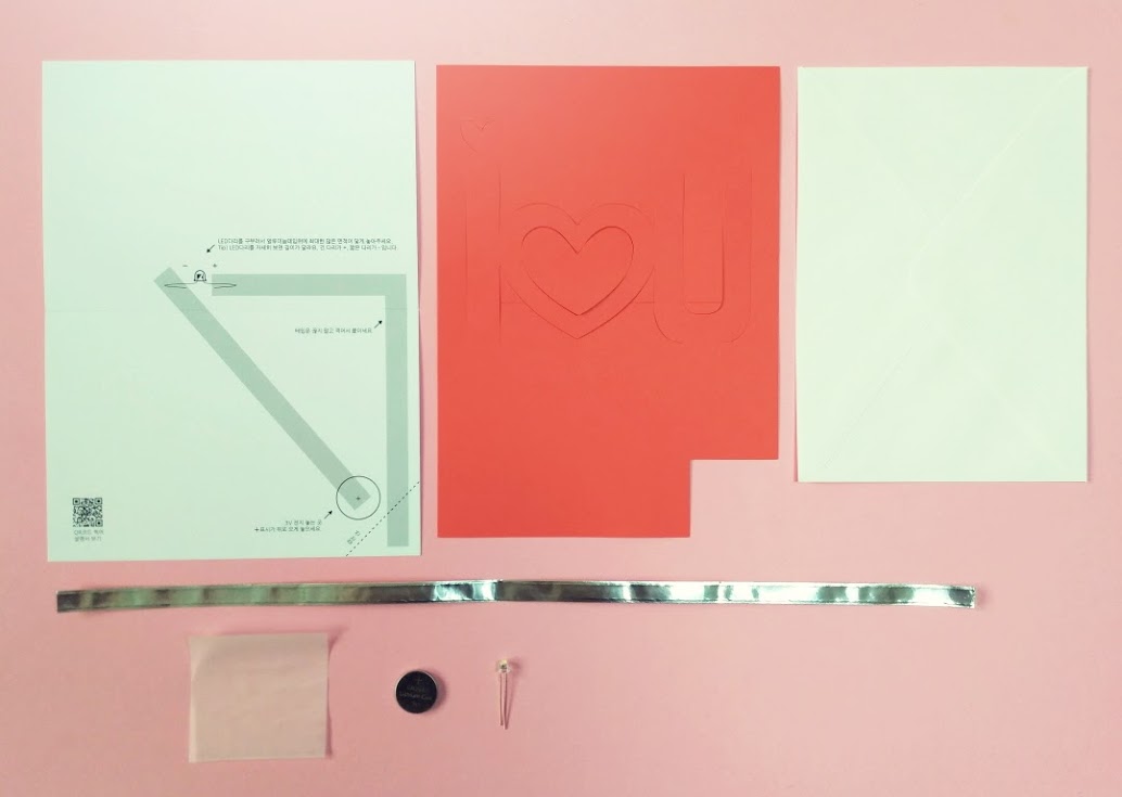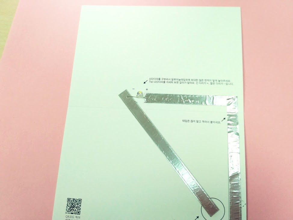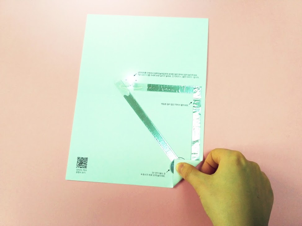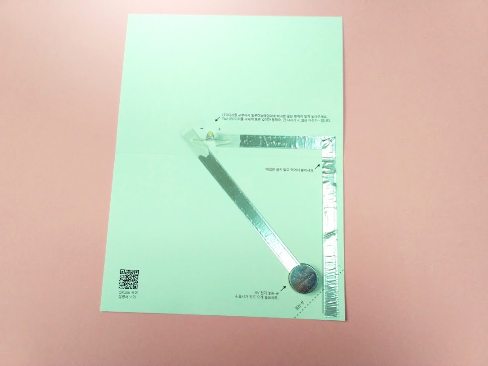 준비물은 카드종이, 팝업도안, 전도성 테이프, LED, 3V전지, 풀과 가위입니다. 테이프 2줄을 붙여줍니다. LED 다리를 구부려 테이프 사이에 놓습니다. 고정되게 그 위를 다시 테입으로 붙여주세요. 아래에 3V전지를 놓고 모서리를 접어 스위치처럼 누르면 빛이 들어오지요. 팝업도안 준비 색종이와 펜으로 꾸며주세요. 영상으로 제작 과정을 확인하세요