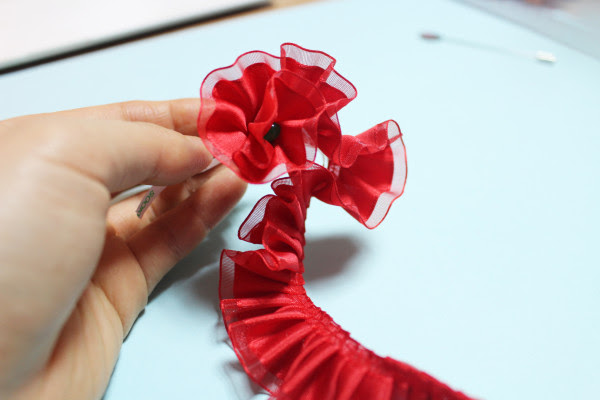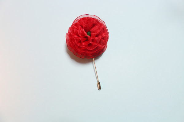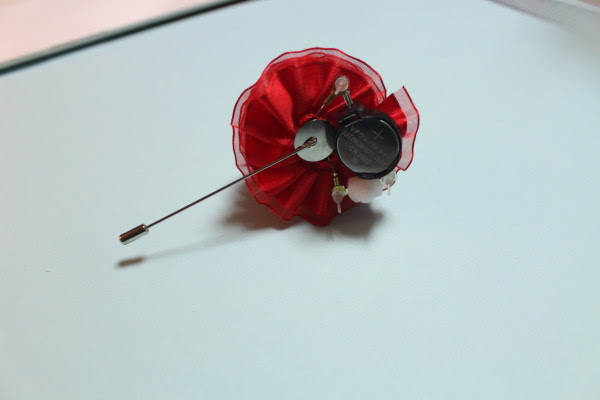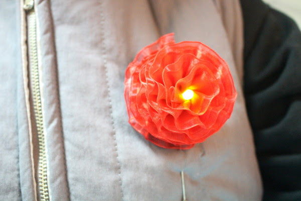 요렇게 되면 성공이예요. 가운데 LED가 쏙 나오게손으로 리본을 다듬어주고 사진처럼 뒷면에 부토니에핀을 글루건으로 붙여줍니다.